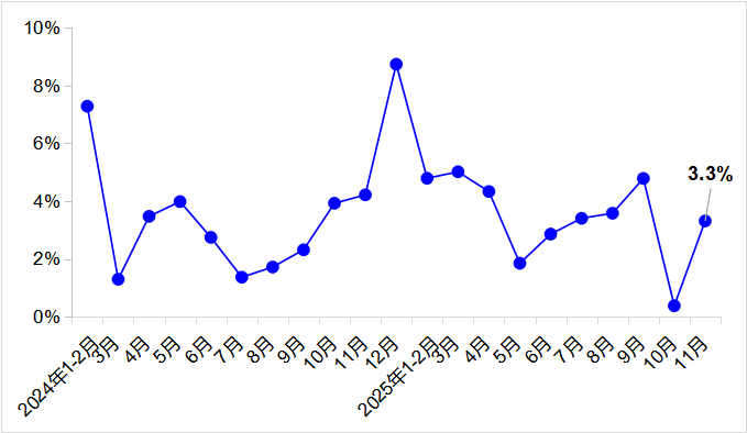 11月,完成营业性货运量52.6亿吨,同比增长3.3%。其中,完成公路货运量38.8亿吨,同比增长3.6%;完成水路货运量9.2亿吨,同比增长3.3%。