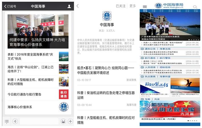 二是深化政务微信信息公开。继续优化海事新媒体平台,充分发挥"中国海事"政务微信平台信息公开作用,逐步拓展公开内容范围,目前已覆盖最新政策、通知公告、重大新闻资讯、海事活动、各类专题、海事人物/故事、政策解读、科普知识等内容。推动"中国海事"公众号信息入驻人民日报客户端,整合资源、增强信息透明度、提高服务质量,切实满足社会公众对于海事信息公开的需求。截至2016年12月31日,中国海事微信公众号总用户数已超过45000人,全年用户数量增长逾一倍。